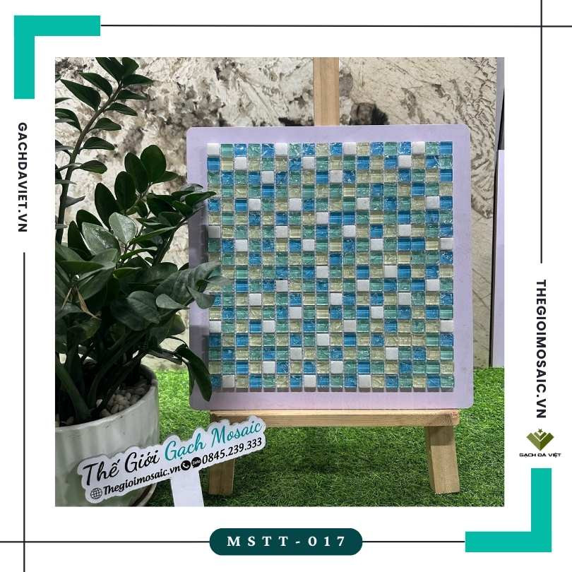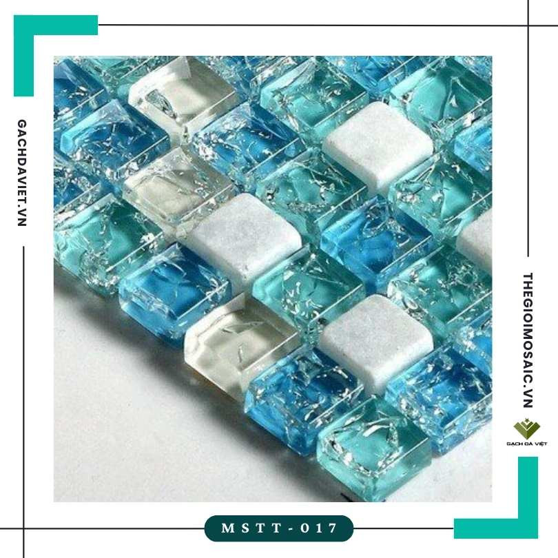 Gạch mosaic thủy tinh màu xanh đá trắng rạn KT 15*15*8mm MSTT-017